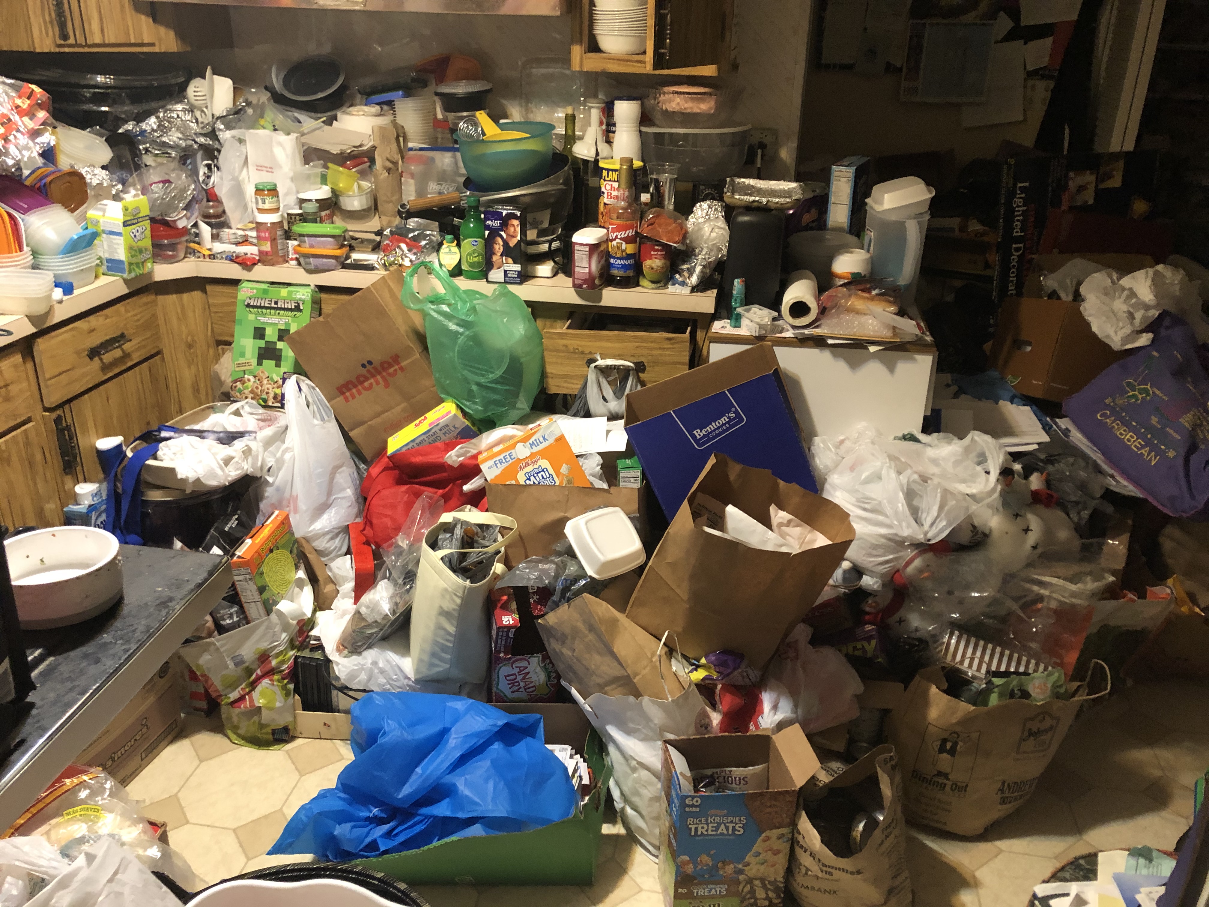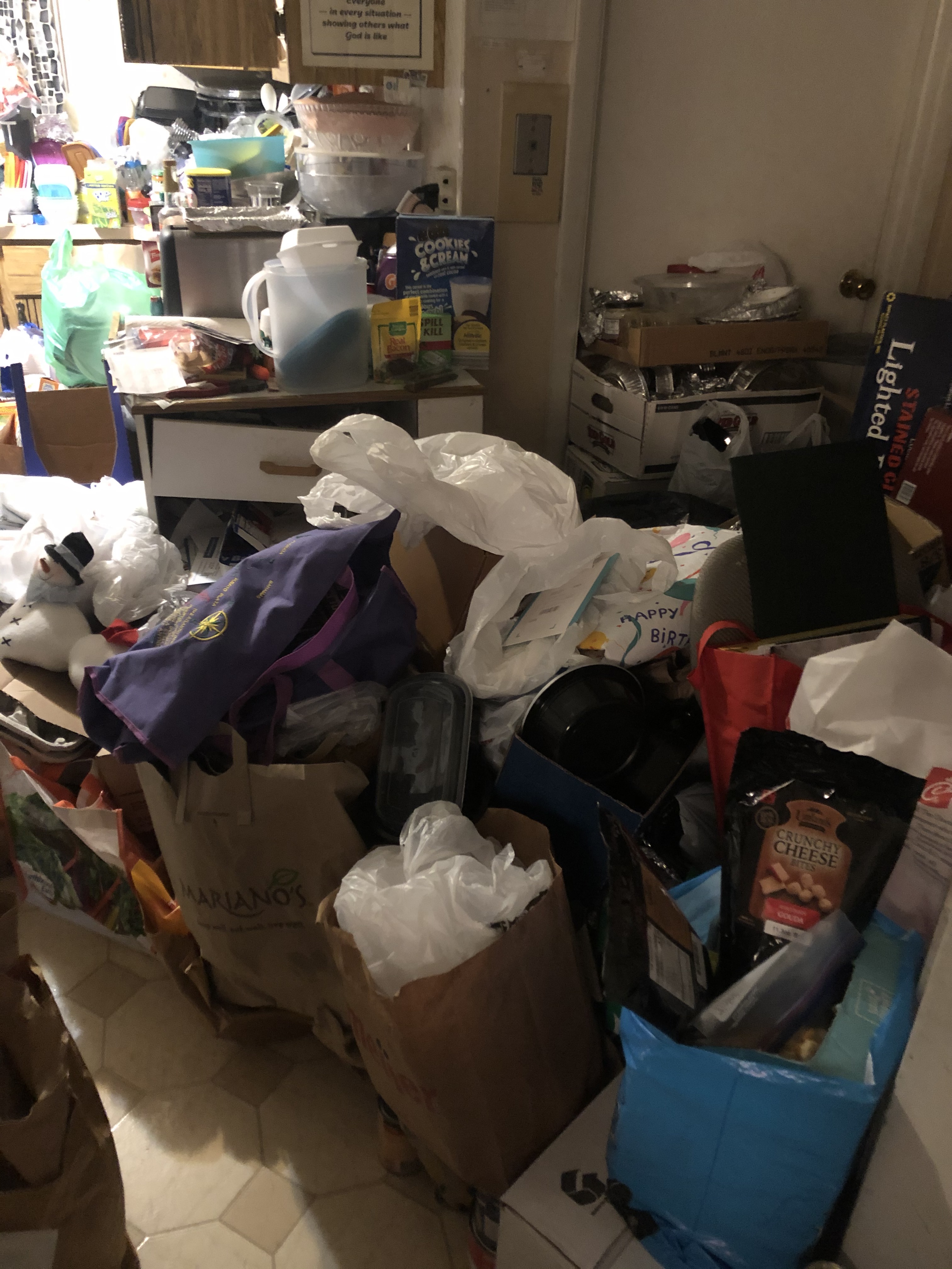 So we would build up leftovers from these places, even as we also did grocery shopping for certain things (such as Chompers’ meals – I swear, that old man eats more vegetables than any of us. Another reason he’s lasting as long as he is). And when we ran out of pantry space, it just wound up on the floor.