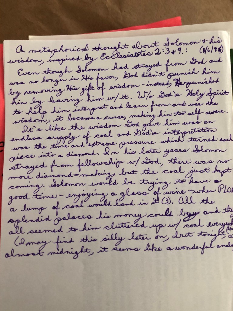 “It’s like the wisdom God gave him was an endless supply of coal, and God’s interpretation was the time and extreme pressure which turned each piece into a diamond. In his later years, Solomon strayed from fellowship with God, there was no more diamond-making, but the coal just kept coming. Solomon would be trying to have a good time – enjoying a glass of wine – when plop! a lump of coal would land in it. All the splendid palaces his money could buy, and they all seemed to him cluttered up with coal everywhere.