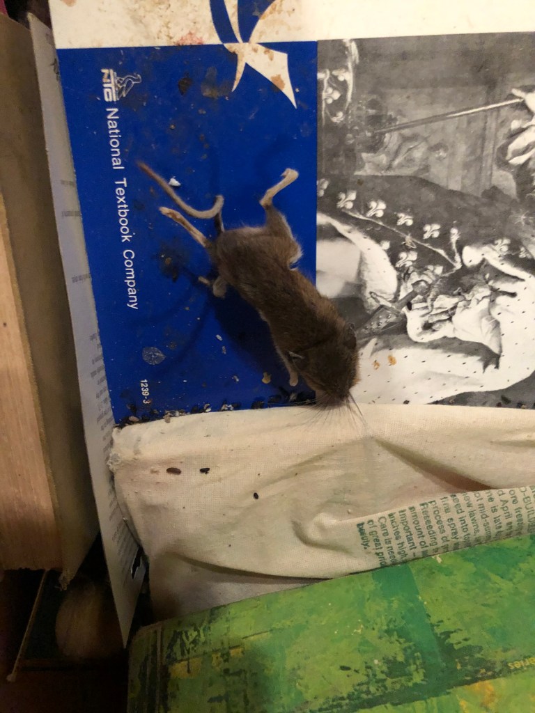 And it doesn’t matter that the mouse is dead and desiccated. He’s still there, and that ruins everything. So, out the box goes.