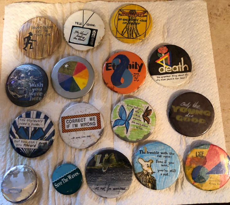 Erin showed me a badge, a button, among a number of similar items that Jan had thrown out late in the previous week while Erin was there and I wasn’t. Some of them were apparently commercial and thus meaningless, but the one Erin held was one of a number I had drawn and assembled when I was in college (I’d had this gadget that manufactured buttons back then – I’d wager it was lost some time ago). I acknowledged that fact to her, and she promptly volunteered to dig around in the dumpster to find the rest of them, as she thought she knew where they had been thrown.