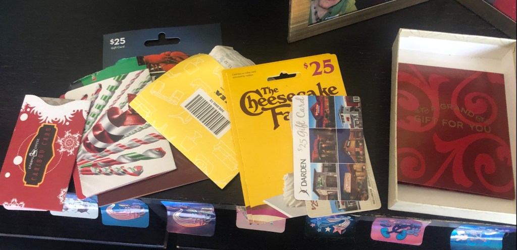 So we started in, carefully, because as with the sunroom, there was – and still is – a tricky mix of scrap paper, junk mail, documents of varying levels of importance (although most are so out of date as to be indistinguishable from junk mail – “Throw away your old bank statements; keep your old love letters,” goes the old commencement speech, and I really can’t argue with it), and holiday cards and letters. Jan still does her little happy dance when she finds money, but now, more often than not, she’s been finding a whole host of gift cards: