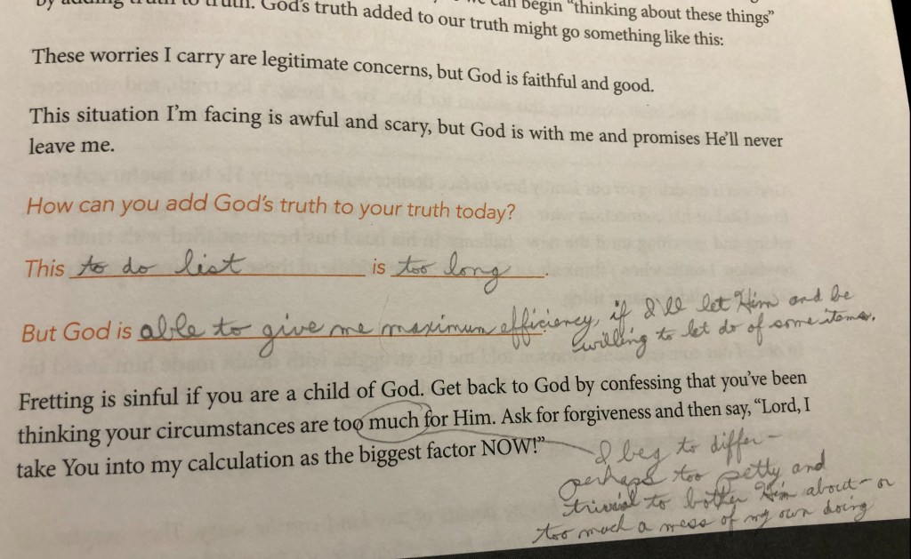 But here you talk about leaving the worry to God – and the thoughts that prevent you from doing so. Specifically, while the author suggests that we as humans generally think of our problems as too big for God to deal with, you turn that on its head (and that makes so much sense, honey, as what could possibly be too big for God, after all? He’s God – if He holds the infinite universe in His palm, what could possibly be too big for Him?), and point out that we – and specifically, you – sometimes would consider your problems to be too petty and trivial for His notice or concern.