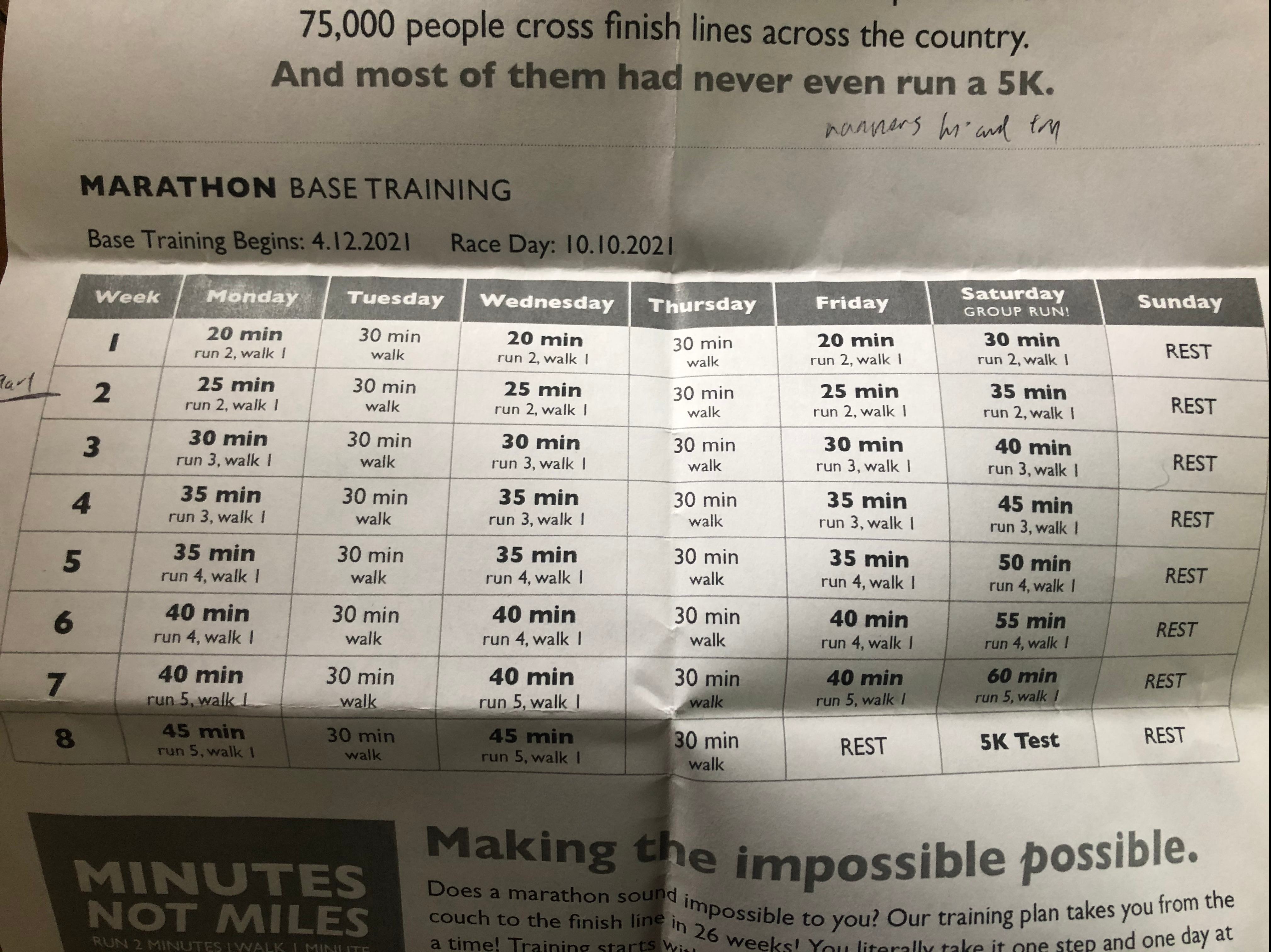 In the meantime, they have a training schedule, starting with the second week, of amounts of time and distance to work up to:
