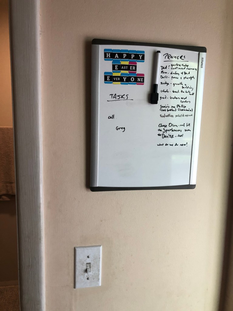 Eventually, I tried to set up a system of listing things and people to pray for a little whiteboard outside of the bathroom. We also used to use that as a to do list back-and-forth between each other. As you can see, most of the tasks have been erased, because who is there to remind anymore?