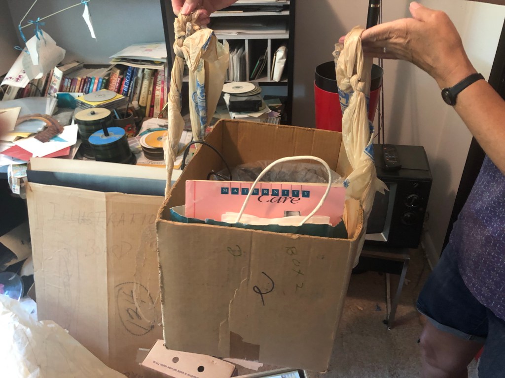 And speaking of scrap, there’s a lot of scrap paper on the floor as we walk in. Some things might well be worth keeping, like instruction manuals for some of the VCRs that still exist in the bedroom – and if I’m not mistaken, the family room as well. There, too, was the occasional recipe, which I expect was out because you used it for one thing or another, rather than it being in the little box on the one bookshelf, so that needed salvaging. But for the most part, it was various miscellaneous paperwork – old bills and bank statements – nothing I should really be keeping, especially after all this time.
