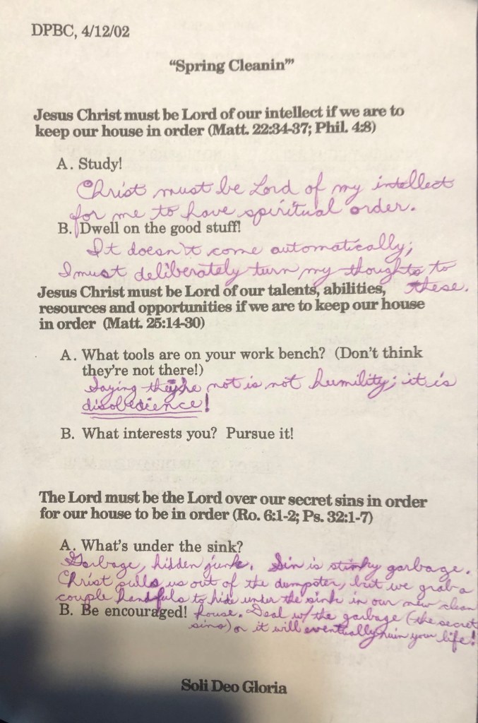 I know that I mentioned the cache of BSF workpapers as Jan and I were going through the upstairs office on Thursday, and I did consider showing a page from that collection by way of example (I also realize that this hasn’t anything to do with Father’s Day, but you had something to say about that with last week’s post), but this sermon note, written nearly twenty years ago, seems more relevant to what I’m being going through (and am still going through) as I continue to pick up after you this one last time. I don’t think I can speak for any metaphorical secret sins, but certainly the literal – well, I wouldn’t necessarily call all of it garbage, but there was a lot of unnecessary stuff that you (and by extension we) could not get rid of for all this time.