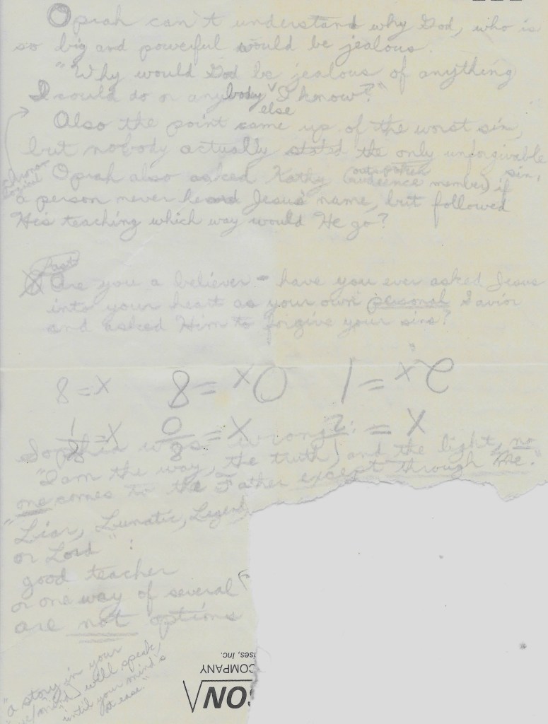 “Oprah also asked Kathy (outspoken audience member) if a person never heard Jesus’ name, but followed his teaching, which way would he go?