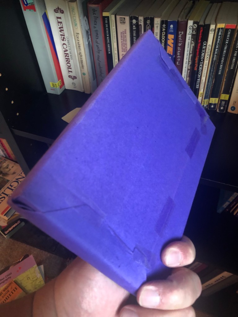 One last book for now: in amongst the back row of books, I found one wrapped in purple (of course) construction paper. Apparently, it was a gift you received that you never even got around to opening.