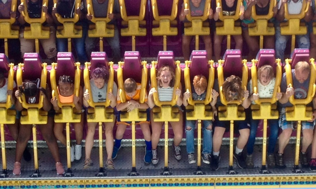 Yes, I know that amusement parks such as Cedar Point and the like are meant to emulate the look and feel of the old-time carnival fairgrounds, but in a much more permanent and sturdy form. None of this “here they are, now they’re gone” transience. These rides may give you a scare, but they’re safe – as long as you don’t go to doing something stupid like jumping over a fence marked “do not enter” looking for your hat that blew off when you were riding the coaster previously.