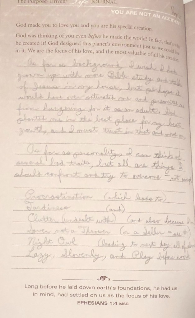 Since you filled out nearly every day in this book, I figure I might as well make a weekly series out of it. Thank you for being so faithful in filling this thing out (at least until the last couple of entries). I’m not quite sure what happened in those last few days. Regardless, it’s better than I ever did with this study. And you certainly went into a lot more depth into who you are, and where you wished you could be, than I ever would have.