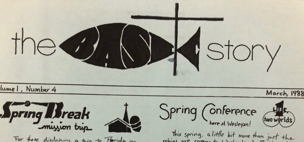 You may or may not remember – you weren’t involved in the conference at the time, I don’t think – but I do think it was one of my later years in college, so you were around at the time. There was a state wide conference of Baptist Student Unions, and the theme was “One Life, Two Worlds.” I had drawn a logo incorporating a large number one and two circles representing the worlds for our campus newsletter.