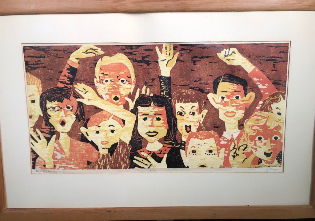 The thing is, this picture was done by your mom before she met your dad (hence the signature Jo Gecsy – indeed, I thought I remembered you referring to the picture’s title as “Help Me, Mrs. Gecsy!” rather than the more everyman title “Help Me, Teacher!” that she actually signed it with), after her first husband passed away, and she went back into teaching to make a living. Presumably, some of her students might even recognize themselves, if they squint hard enough. So it has a family story behind it, that gives it a little more meaning to us than it would to anyone else who might own it.