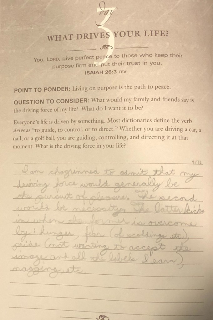 “I am chagrined to admit that my driving force would generally be the pursuit of pleasure. The second would be necessity. The latter kicks in when the former is overcome by: hunger, fear (of scoldings etc.) pride (not wanting to accept the image and all the labels I earn), nagging etc.”