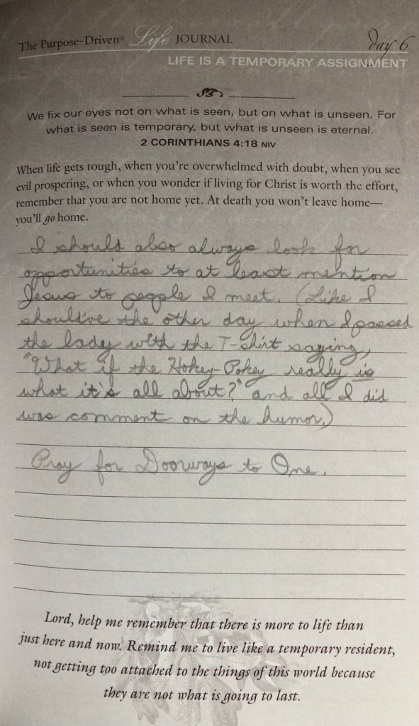 “I should also always look for opportunities to at least mention Jesus to people I meet. (Like I should’ve the other day when I passed the lady with a T-shirt saying, ‘What if the Hokey-Pokey really is what it’s all about?’ and all I did was comment on the humor.