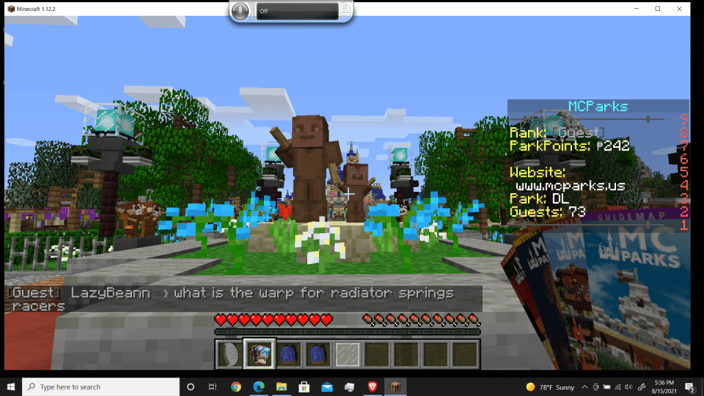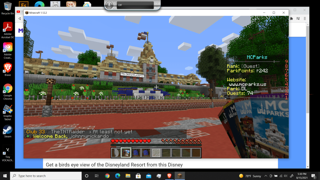 I wish I could show you pictures from where we were – be it the monorail, the Haunted Mansion, the Pirates of the Caribbean, Splash Mountain (I insisted on heading up there before they took it down out of the Minecraft world, what with Song of the South being, ah… problematic) – Except I didn’t think about it at the time, and just as we were getting to the cars for Splash Mountain, the Internet cut out on me. Lost Minecraft, lost Skype… I had to call him and apologize, because I didn’t know when I’d be back, and I obviously couldn’t play games with him at that point. At least we got in a couple of hours running around in this place.