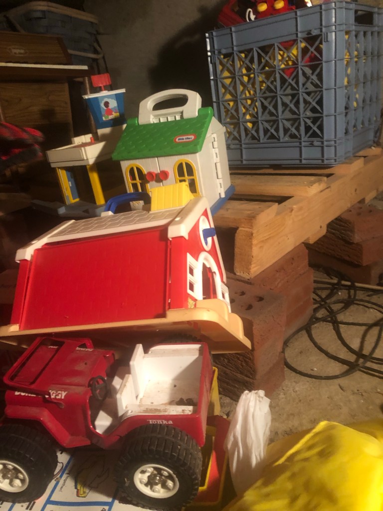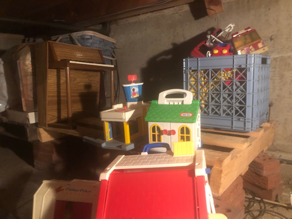 You see, way back in the crawlspace, unbeknownst to Daniel and I, you kept every Fisher-Price toy I think any one of us had. That wouldn’t be so bad in and of itself, except down here, the mice have gotten into things at some point in the past twenty years, and things, well… let’s just say that Jan tells me that she can’t, in good conscience, send these things off to Goodwill at this point.