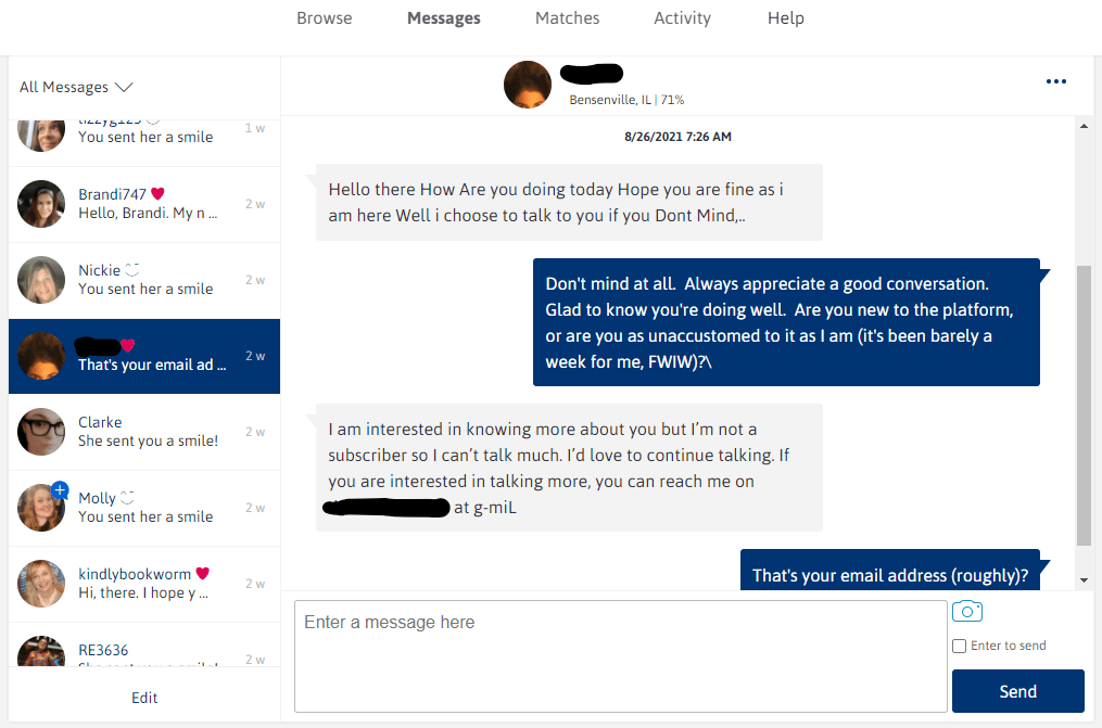 I did respond to her, asking about her illness, as well as her interest in aircraft and where in the country she was from prior to locating in suburban Bensenville – and also attempting to give a basic description as to what I might be looking for from a potential romantic partner, per ‘her’ own inquiry – and I got this absolute WALL of text from ‘her:’