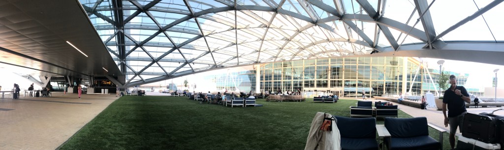 Fortunately, he knows his way around here, having been here I don’t know how many times before, and when I text back to him, he knows where I am almost immediately when I tell him which baggage carousel I’m at. So he comes to get me, and I follow him to this atrium between the airport and a hotel nearby.