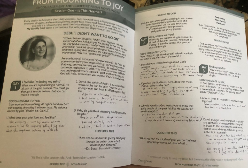 Well, it seems the ethos has somewhat rubbed off on me. Or maybe I was always a little like that to begin with (which would certainly explain our attraction to each other, if we agreed on something like this to a greater or lesser extent). The Grief Share workbook that accompanies our weekly meetings includes daily homework, which I just started today. Which means I’ve got to do three days worth of work in order to keep up.