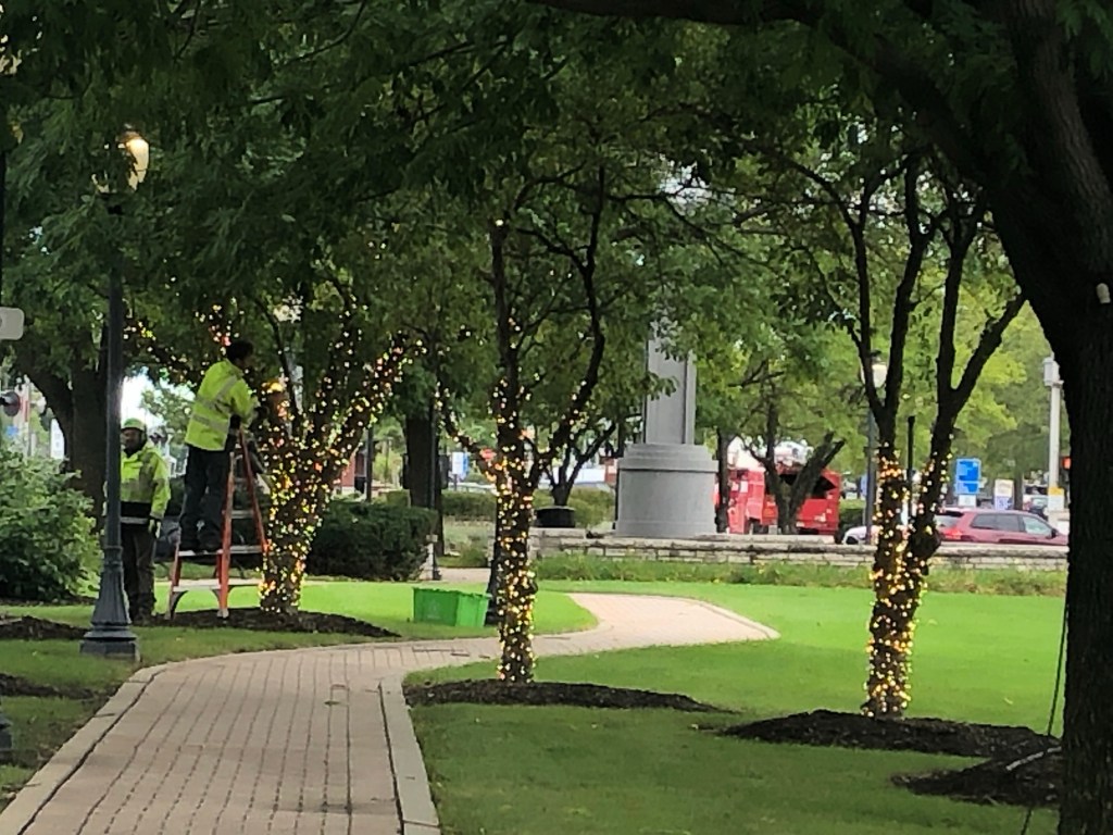 Turns out, the trees are evidently wrapped in lights year-round, and these gentlemen are simply testing those lights, to make sure that they will work when the season begins – which I want to make perfectly clear has not begun. It’s just easier to take care of it now, when the weather is… reasonable, rather than wait until November or December to find out that one bulb is burned out, and that an entire skein of lights needs to be replaced in the middle of winter.