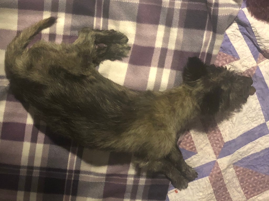 …to find Chompers sprawled approximately where I have left him, with the container of food upside down on the pantry linoleum. The kibble in the vegetables were spread across both the carpet and the linoleum, and he hadn’t made any effort to go after any of it.