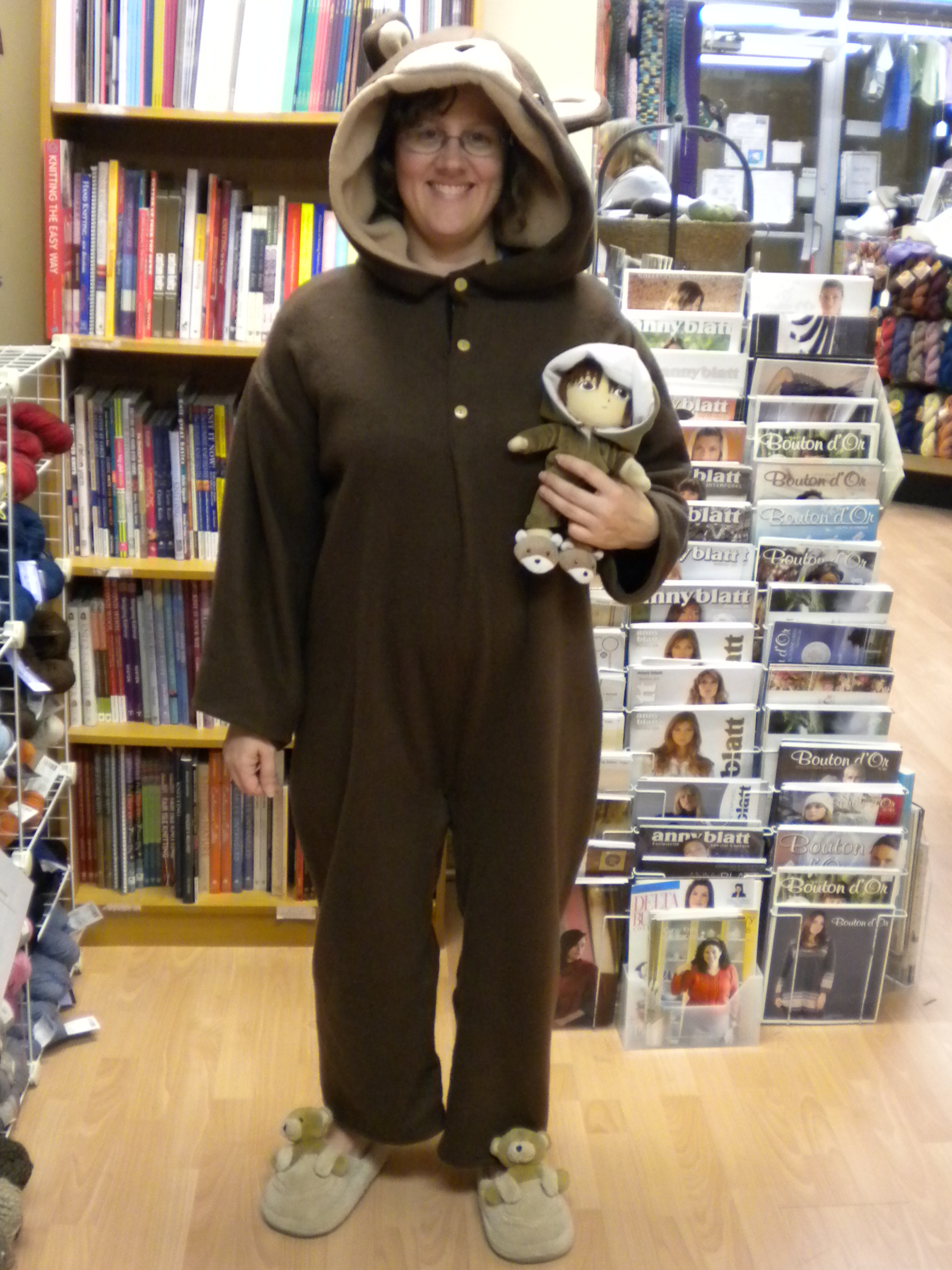 I think the costume that you treasured the most, though (aside from the scarf that you’d been knitting way back in college), were the bear pajamas from Serial Experiments Lain. The moment you saw that character padding around in those PJs, you pointed at the screen and said “I want one of those!” And after a lot of research, and a fair amount of hunting at various fabric stores, the three of us (you, me and Ellen) managed to put it together, complete with bear slippers and a doll of ‘yourself.’ I think you wore it to at least three Anime Centrals, although you did remark on how warm it kept you in the middle of May, which was not necessarily a good thing.
