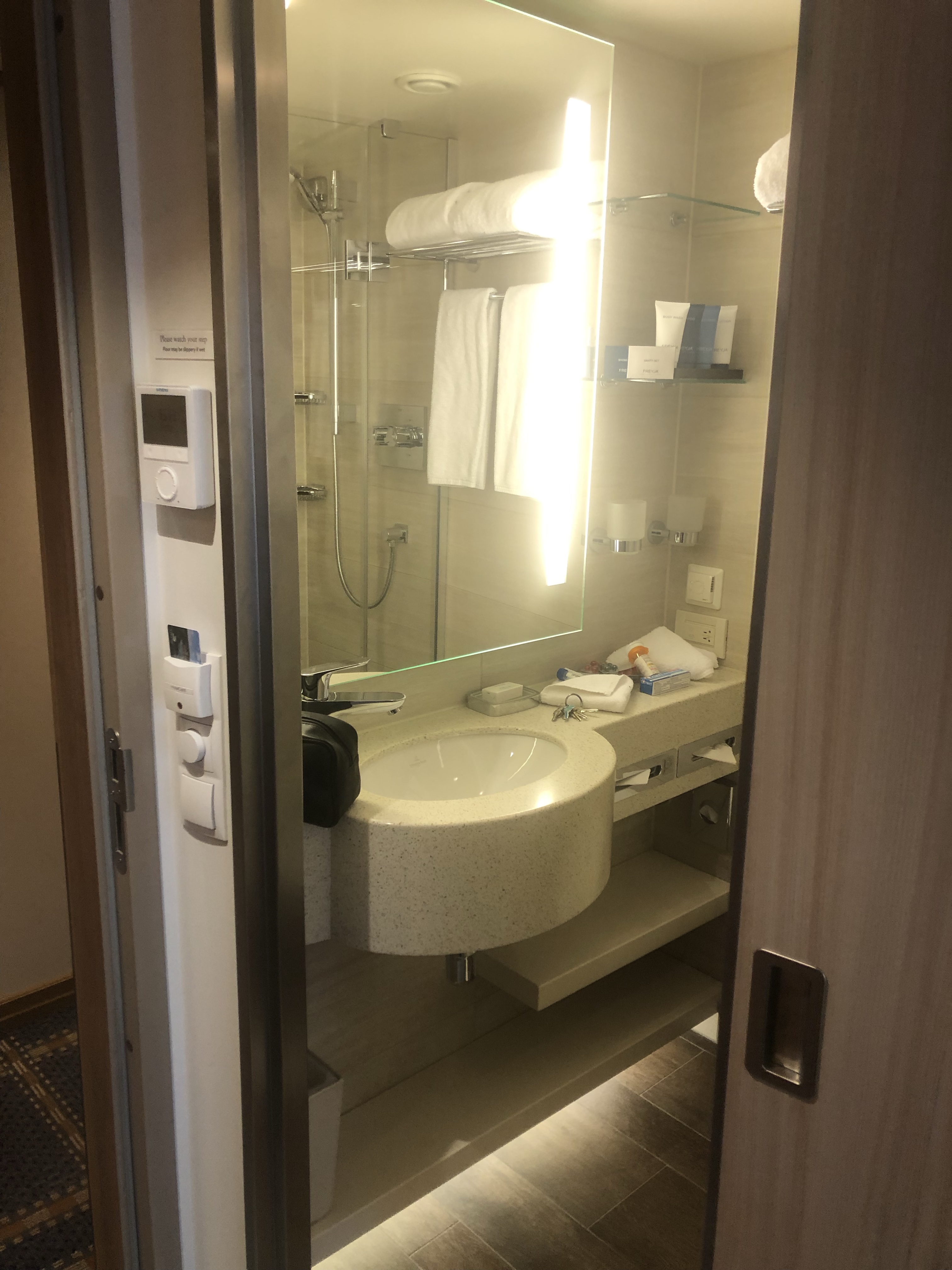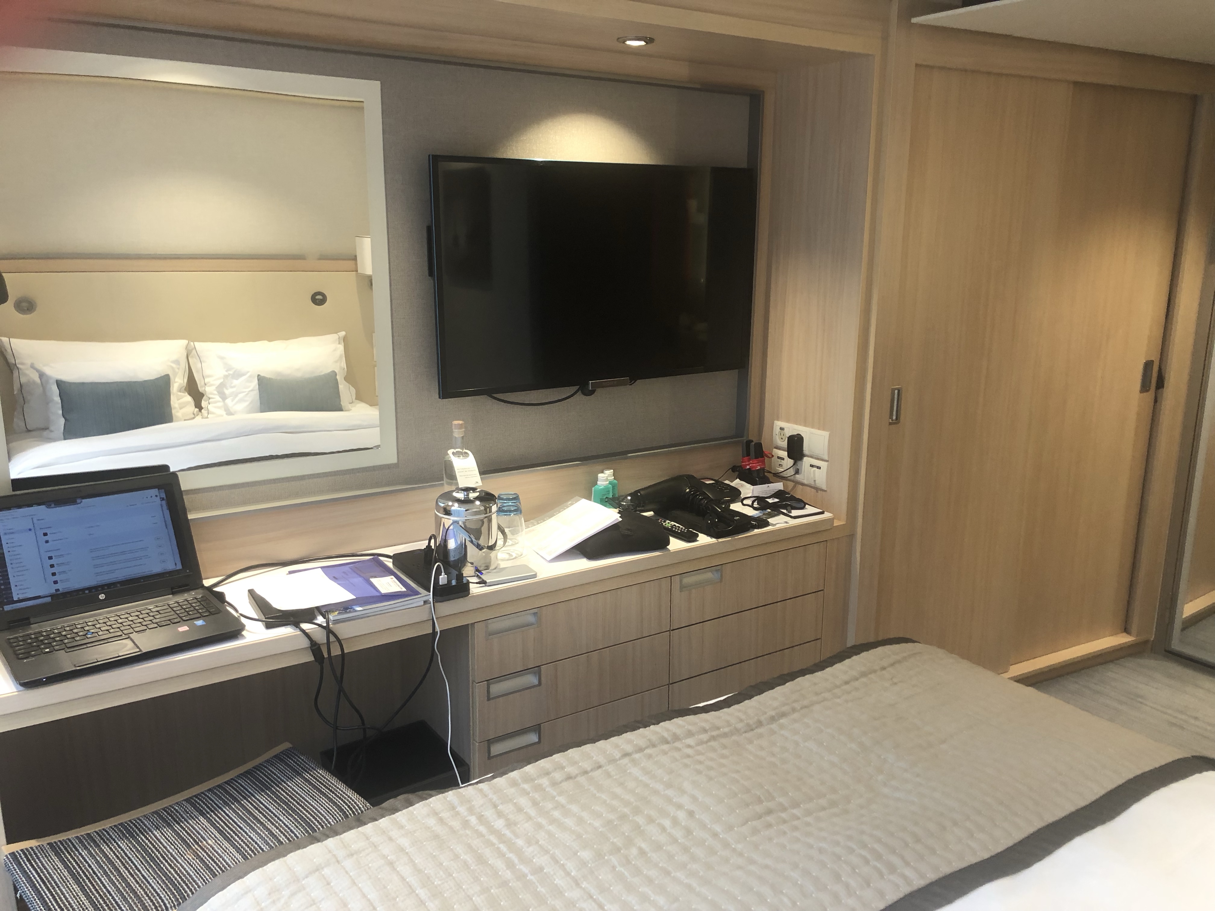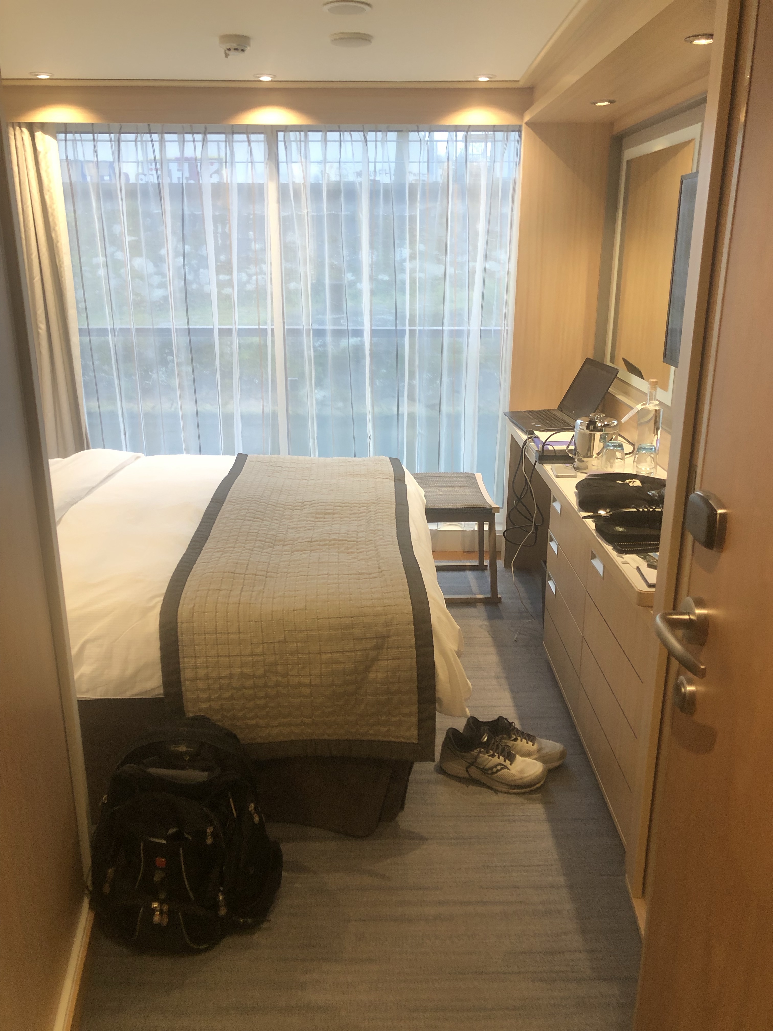 So for the time being, I’m confined to quarters, which is to say, I’m shut up in my stateroom (room 210 – which is, as it happens, the exact same room I stayed in at the Hotel Euler, believe it or not) until such time as they get results back from a saliva sample they had me provide for them to do their own testing.