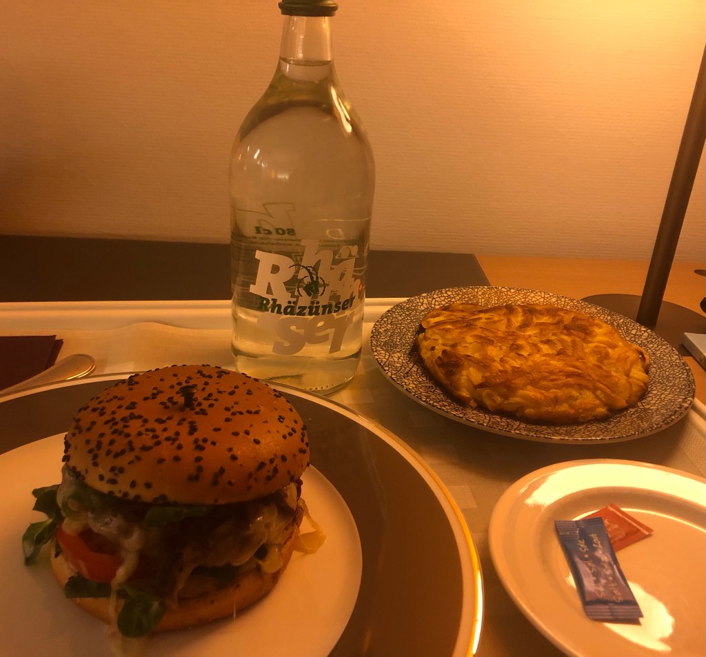 The Roesti potato (which is kind of funny in and of itself, because that’s what they called those little fingers from breakfast – I didn’t expect to see it in a hash brown pancake form) is okay, but it needed flavoring… so I just set it on the main plate to soak up all the juices that fell out of the burger.