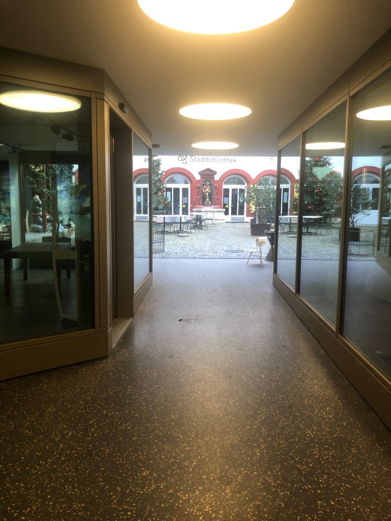 It’s trying desperately to rain, despite the fact that the sun is out in patches as well. It’s all very strange. I duck into a corridor that ends up taking me to the entrance of the city library, apparently.
