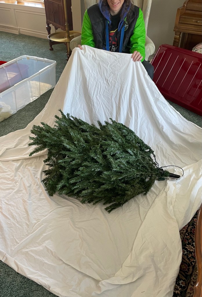I’ve not tried to document how a tree is taken down before; to a certain extent, it’s presumably a routine procedure, hardly worth commenting on. On the other hand, it’s something that’s only done once a year (like making the breakfast soufflé), and it’s not always a task that the two of us have been involved with, so maybe it wouldn’t hurt to record the process for future reference. After all, who’s to say this won’t be something we’ll need to do in the future (and maybe in reverse come the days after Thanksgiving)?