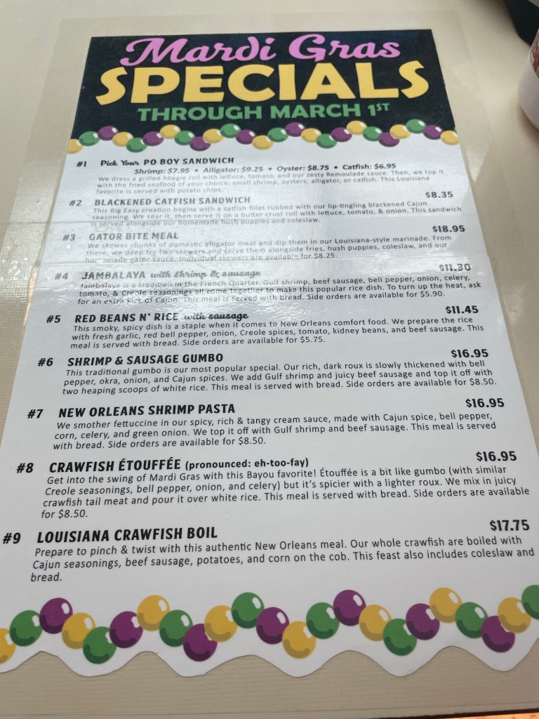 Anyway, having found something I considered to be much better than fish chips, I took care of my own order. I also took note of the fact that I might be able to get something for Daniel from here; at least until Mardi Gras, they’re offering alligator, which we did enjoy down there.
