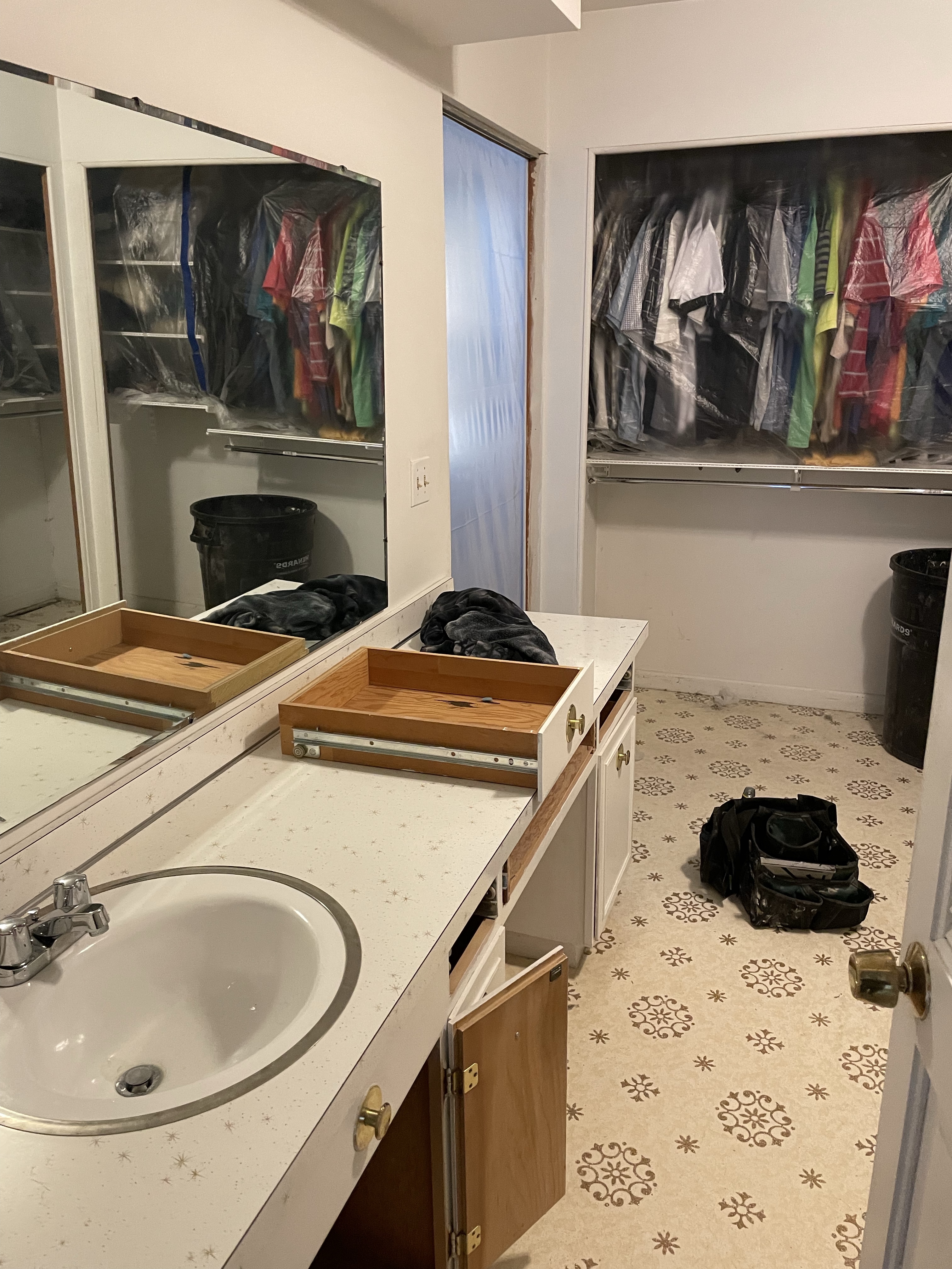 On a slightly less pleasant note, you may have noticed that the ‘after’ pictures are a little bit darker than the ‘before.’ It seems they cut the power to the room, presumably to reduce the risk of electric shock in case of contact with the now-exposed outlets. That’s fairly understandable, but it would seem that the heated floor of the master bathroom is on that same circuit. By June, this most likely won’t matter, but it does make for cold feet this evening.