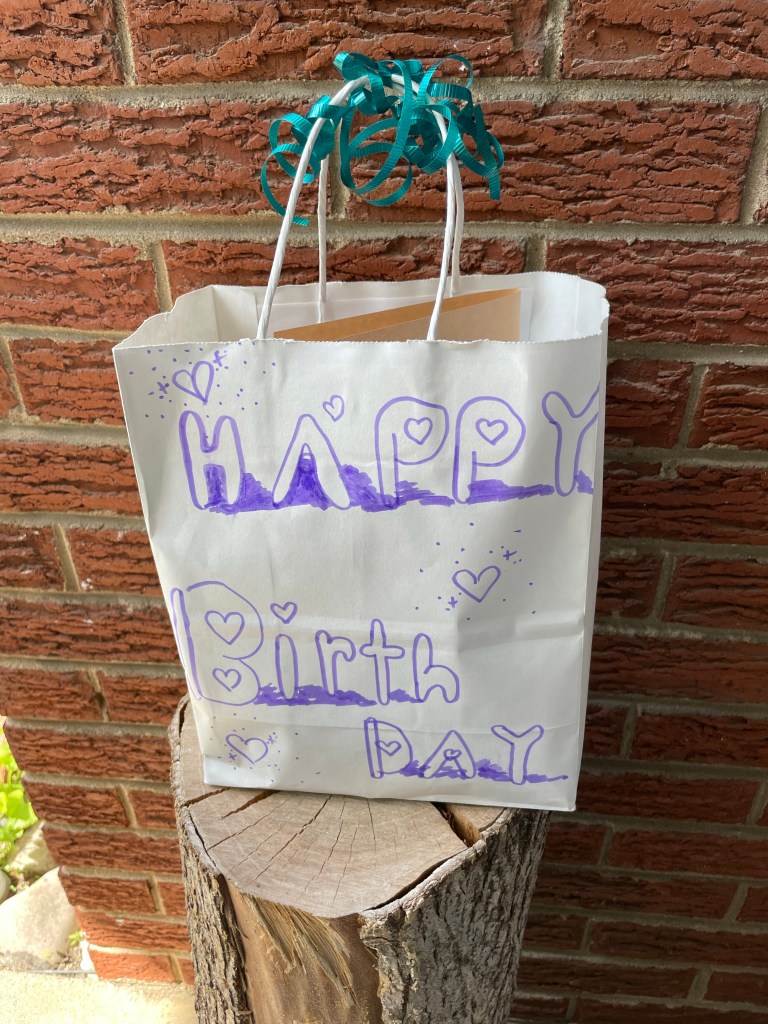 I’m conflicted about such a gift bag. On the one hand, whoever dropped this off knows when your birthday is… or rather, was. And while it may be coincidence, the bag is done up in purple marker, just the way you’d like it. So, they actually know a few things about you, and care. On the other, if they knew that much, wouldn’t they know you were gone? Why bake a cake for someone who’s no longer able to enjoy it? Come to that, how do you even bake a cake with no oven, and any cake pans that might have been retained after these two purges in storage?