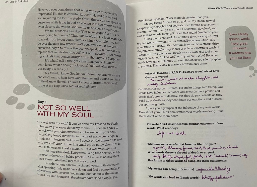 I hadn’t realized until I was just about to put this together that I had emptied out all the days that you had written in Angela Thomas’ “Stronger” study volume, so I’ve moved on to another book; this one being “Me, Myself and Lies” by Jennifer Rothschild, about – of all things – a ‘thought closet’ makeover. Considering the difficulties involved in getting a literal such makeover done for you, this one may have been a challenge – or not, since it’s more figurative than literal.