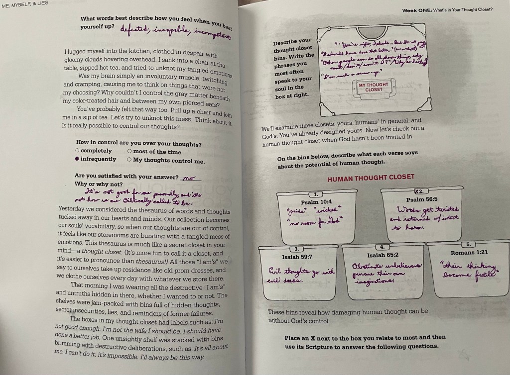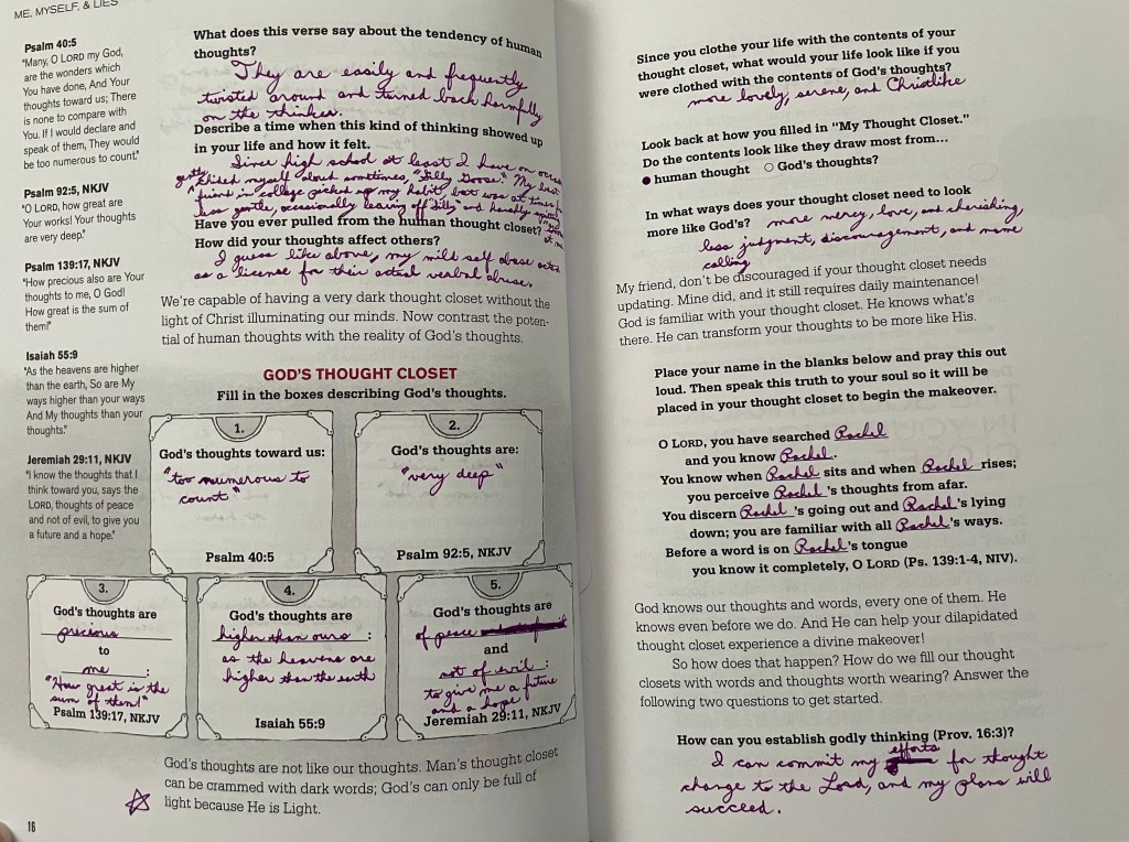 This study did give you the option to claim you were largely in control of your thoughts, and later, that you were satisfied with how much your ‘thought closet’ looked like God’s. I suppose it would be intellectually dishonest to make either of those claims, though. Still – and it may simply be because I keep getting farther from the times when you were here with me, and that more and more, I remember your sweet, cheerful and loving side rather than your faults and foibles – it’s astonishing to see your deep dissatisfaction with yourself.