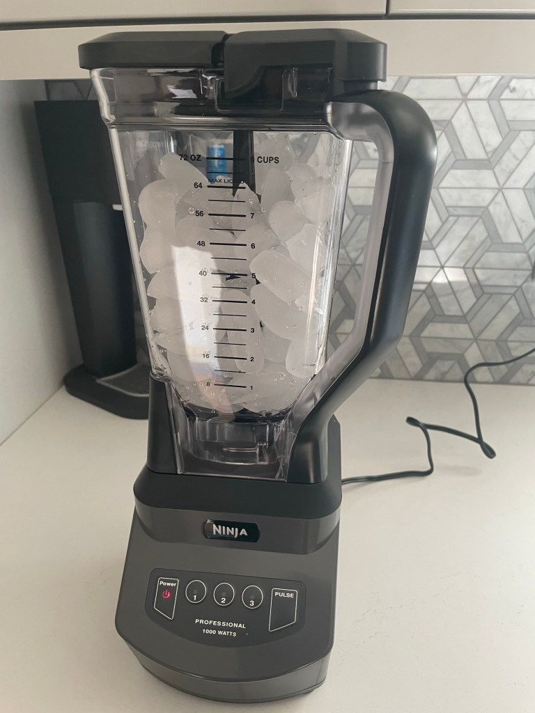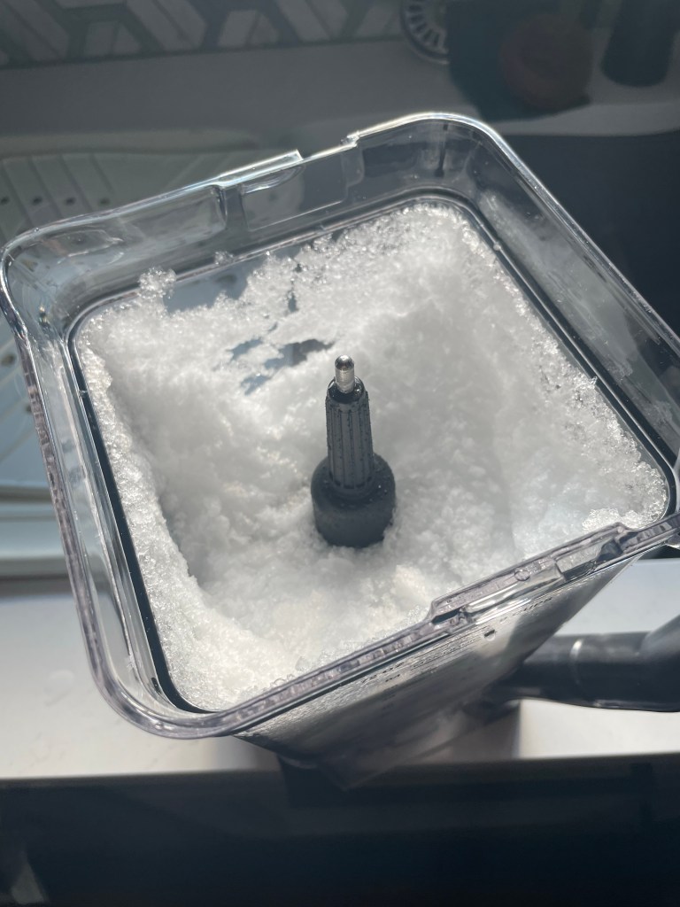 It doesn’t even require being at full strength to chop the ice up like this; I only need the middle setting to render it to this consistency. Although it turns out that ‘consistency’ isn’t quite the right word for it; after a certain point, the ‘snow’ sticks to the sides, and the blades can’t reach all that way over to grind it, leaving fairly large chunks to deal with. On the other hand, I’d over-filled the pitcher by a wide margin, so there was plenty to scoop out and fill a couple of glasses with.