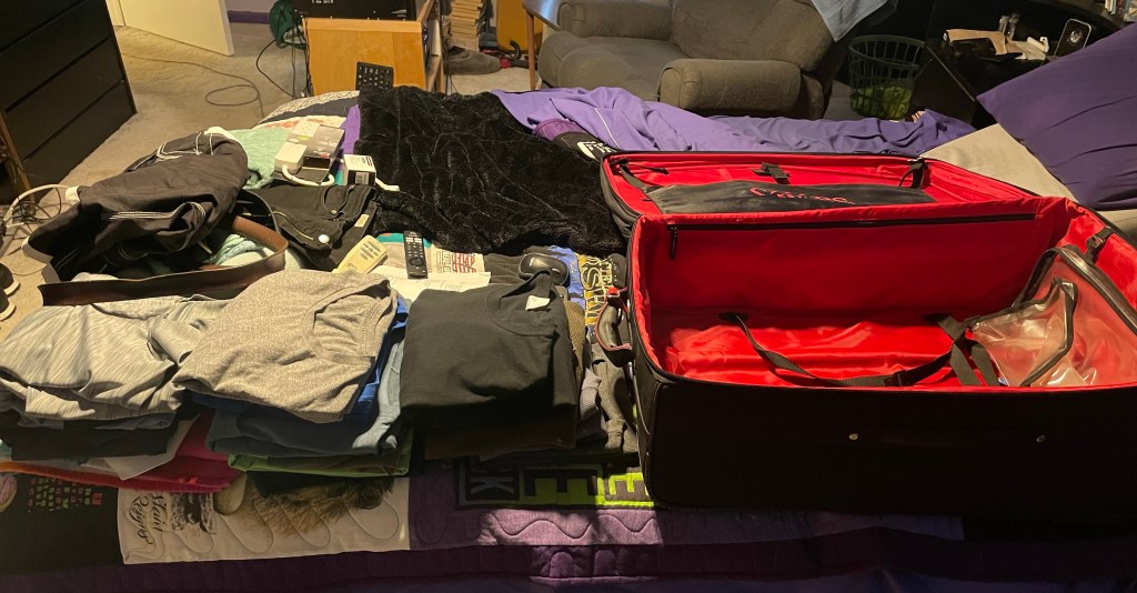 One of the things about packing is that, as you do it, you realize what you haven’t prepared for. You’ll notice I have towels for both Daniel and myself in that last picture. There’s a reason for that; Daniel hadn’t considered that he’d need one. Just before heading off for work, Logan commented somewhat admiringly about how light Daniel had packed for such a trip. I replied that he needn’t be quite so impressed; so many of the truly necessary things he used to leave in your hands to ensure they came with.
