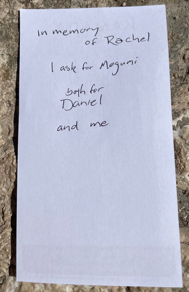 Yael tells us that the notes are collected twice a year, at Rosh Hashanah and Passover, and buried on the Mount of Olives – because it’s what one does with scripture. Had I known that, I would’ve taken a sashet of your ashes.