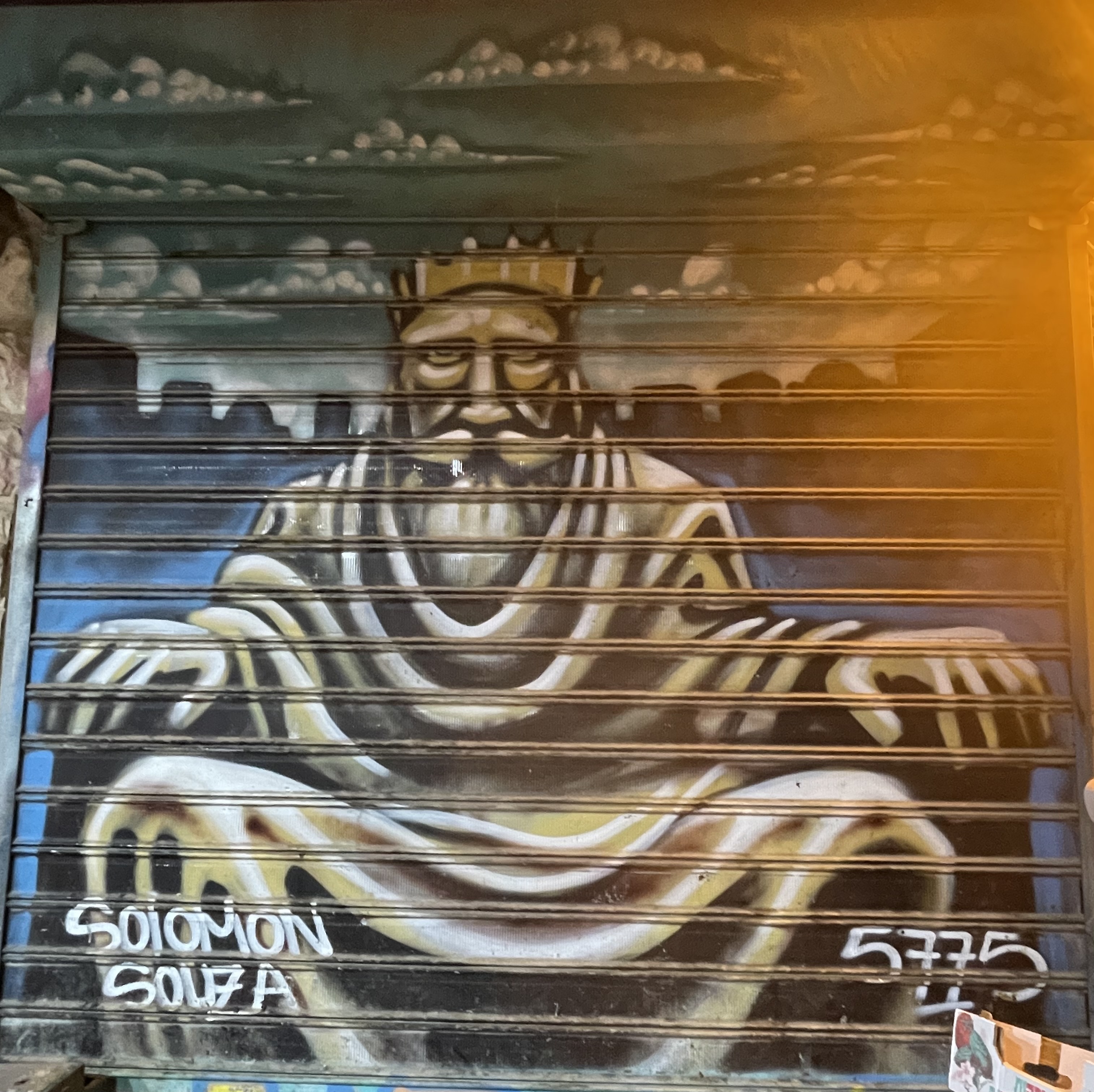 I’m not sure if these qualify as graffiti; it seems (especially in the case of the apologetic señorita) these are deliberately painted on the storefront doors, some even spelling out that they’re closed. Regardless, they’re fascinating. I especially like the fact that the bearded gentleman seems to be eyeing the can of Sprite on the table in front of him as if he really wanted it for himself. It’s really quite cool.