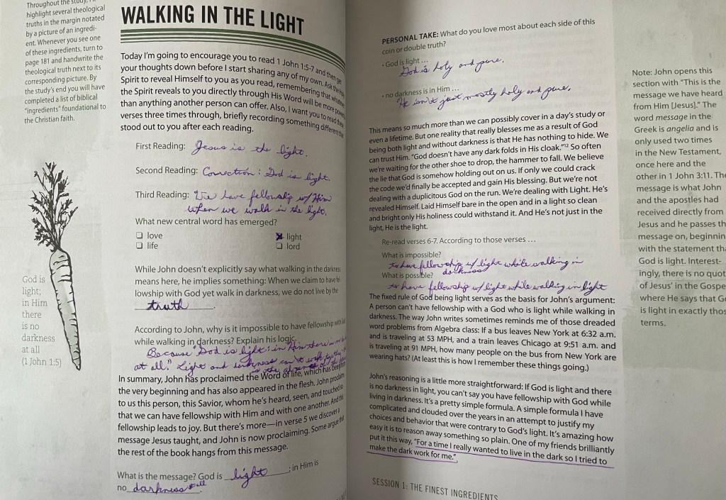 Read 1 John 1:5-7 three times through, briefly recording something different that stood out to you after each reading.