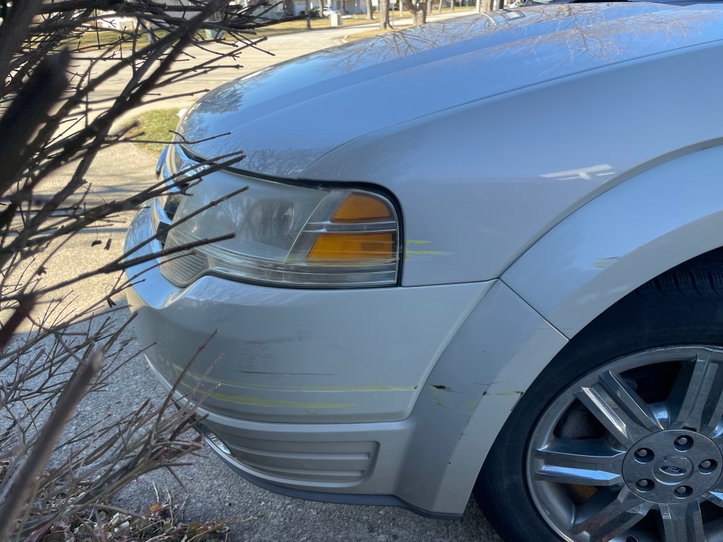 Finally, I saw the curb to my right pulling away from me in my peripheral vision; I’d reached that first side street. I switched on my blinker, and made the turn… and that’s when I saw the truck. One of those big public works trucks (or maybe a ComEd type – I couldn’t see, I still hadn’t cleared the windshield, after all), with tools and equipment hanging on the side. I pulled the steering wheel as tightly as I could, but I still heard the scrape.