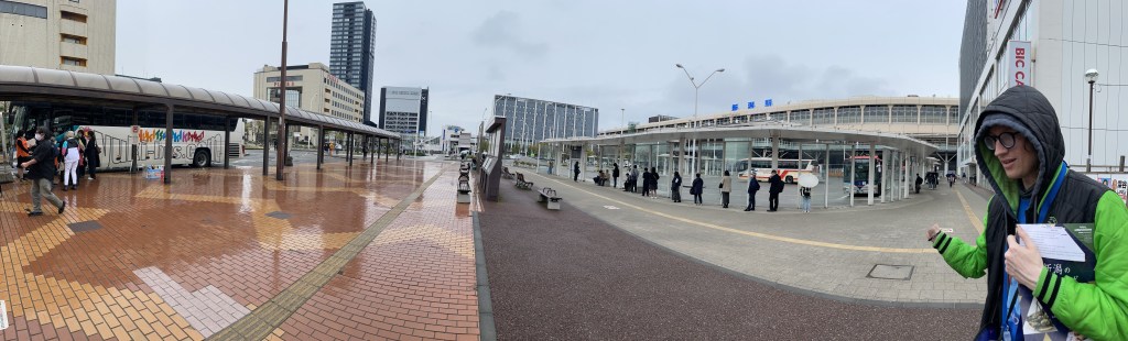And so, here we are, outside of the Niigata train station (with the blue lettering on top). Our bus is still here on the left, in fact.