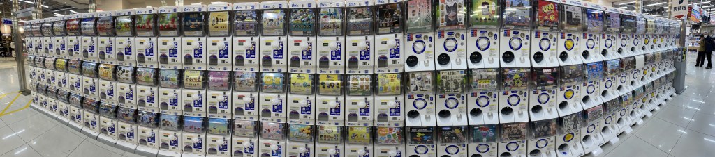 Including this display of dozens of Gatchapon vending machines, selling little pop culture trinkets.