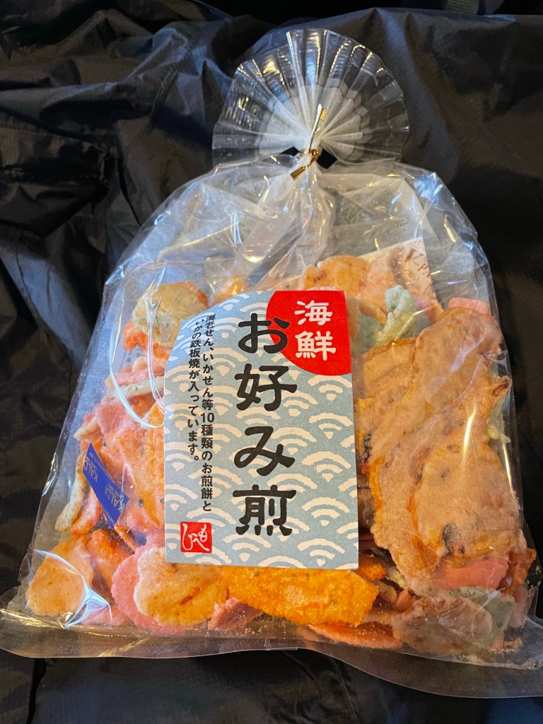 You’ll probably recognize those first three characters on the package, at least; these crackers are apparently okonomiyaki flavor.