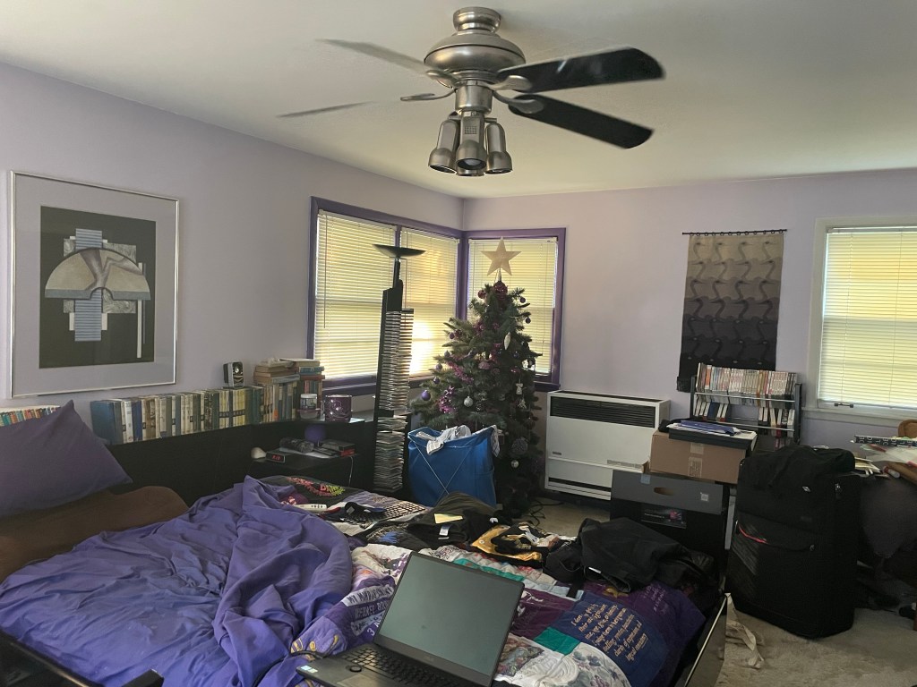 Yesterday morning, I was carrying my cereal bowl into the dining/family room to eat breakfast – I’ve never really managed to find a good, comfortable place to set myself down in the kitchen on one of those bar stool chairs I’d gotten shortly after the remodeling was completed, and the fact that I rarely manage to wake Daniel, even if I’m trying to, gives me little incentive to actually keep my distance from him – when I heard the unmistakable hum of a running motor at the other end of the family room. I immediately assumed that the wall-mounted space heater had flipped on, in response to the air conditioning having brought the ambient temperature down to what it was programmed to think was an unacceptably cold temperature, and went to adjust the thermostat by the pantry before remembering that it no longer controls anything. It was only after a few moments of fiddling that I realized that not only was what I was doing pointless, but it wasn’t the space heater making that noise in the first place, but rather, the old industrial-style steel floor fan that I think you must have gotten for a garage sale many years ago and Daniel, even back then, claimed as his own.