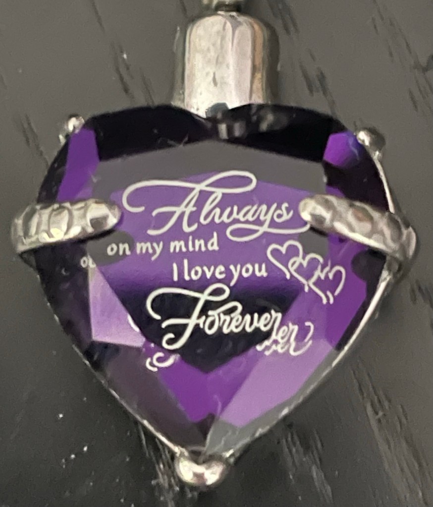 I’ve also thought of another thing to do with a small quantity of those same ashes; while you can’t travel with me the way I’d like you to, I can still take you with me in jewelry form. I’d found a few pendants that serve as small vials, like this one…