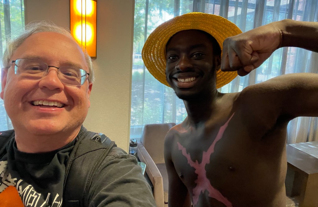 But while I was pondering how to go about satisfying her request, she gestured at a small crowd of cosplayers walking by (not that there wasn’t a constant flow of such attendees, even as things were winding down as they were). She was indicating a fellow dressed as Luffy, the main character – the ‘hero,’ if you will – of One Piece.