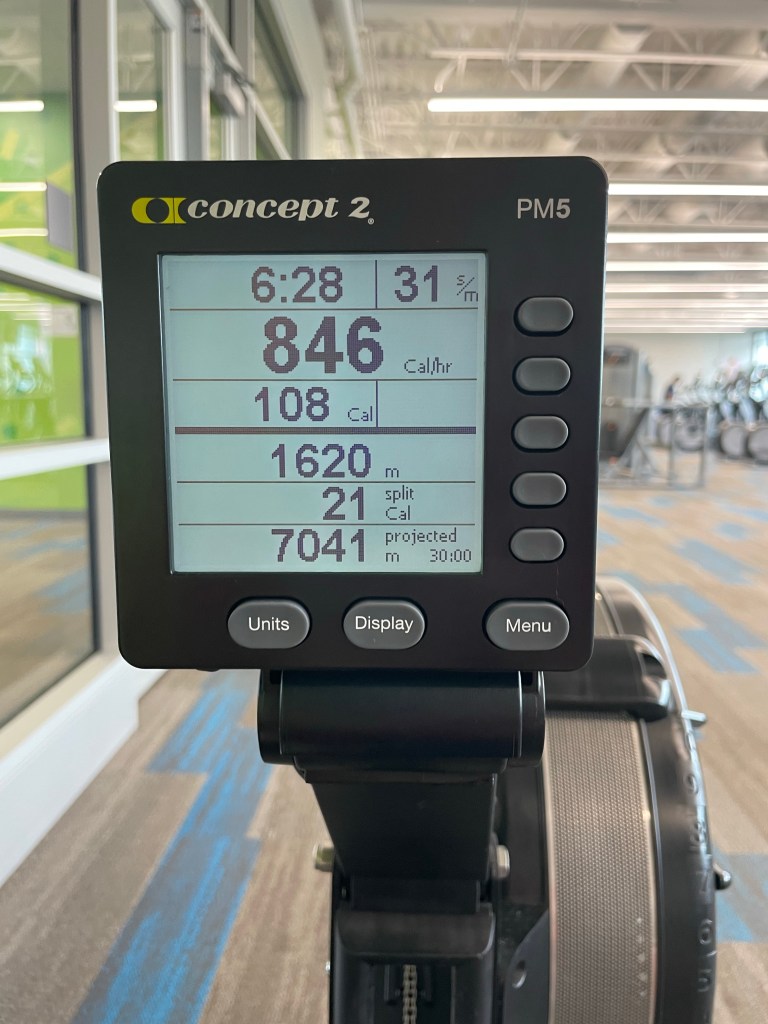 But I had been given a moment’s rest each time, allowing me to re-start at a slightly renewed level of strength, thereby making up for the handful of lost seconds. As a result, I didn’t feel myself burning out until well into my fifth minute (as opposed to feeling it right about at the five-minute mark), at which point the end was only two hundred meters away. But when you’re going at such a pace, the pain starts to build up quickly; even though I had nearly a full minute to cover those last two intervals, I was already feeling it. It didn’t help that the rowing bar was getting covered in sweat (don’t worry, I wiped it off after I was done, as per usual), thus causing me to nearly lose my grip. I did what I could as fast as possible, and this was the final result: