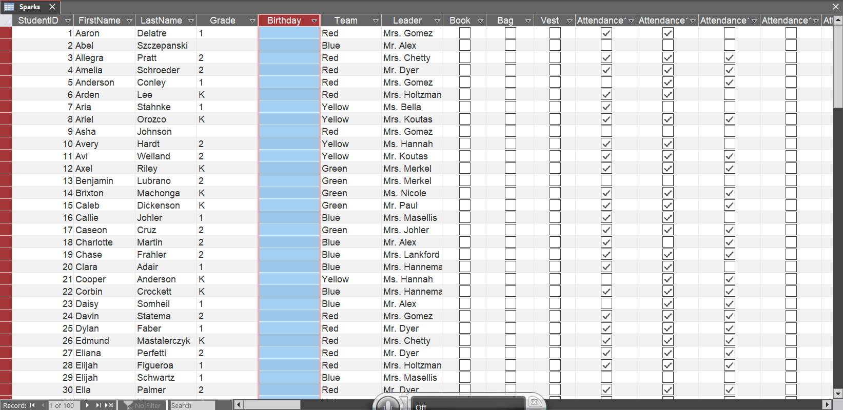 So let me explain it first, and get it out of the way. In fairness, it’s the one that’s mostly complete at this point, anyway. The thing is, with the Sparks club nearly double in size from what it was when you had to go, some things haven’t been able to scale up quite as cleanly as others. One of these is keeping track of registrations and progress toward awards. For some kids, there have been duplication of effort, while others all but slip through the cracks. So, in order to try and get everyone’s records all in one place, I decided to assemble a database of everything and everyone. After all, I have the program as part of the whole Office suite; why not actually use it?