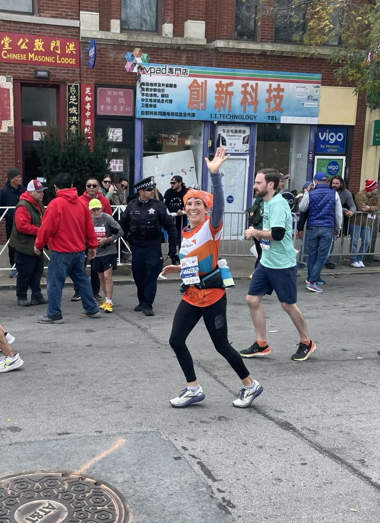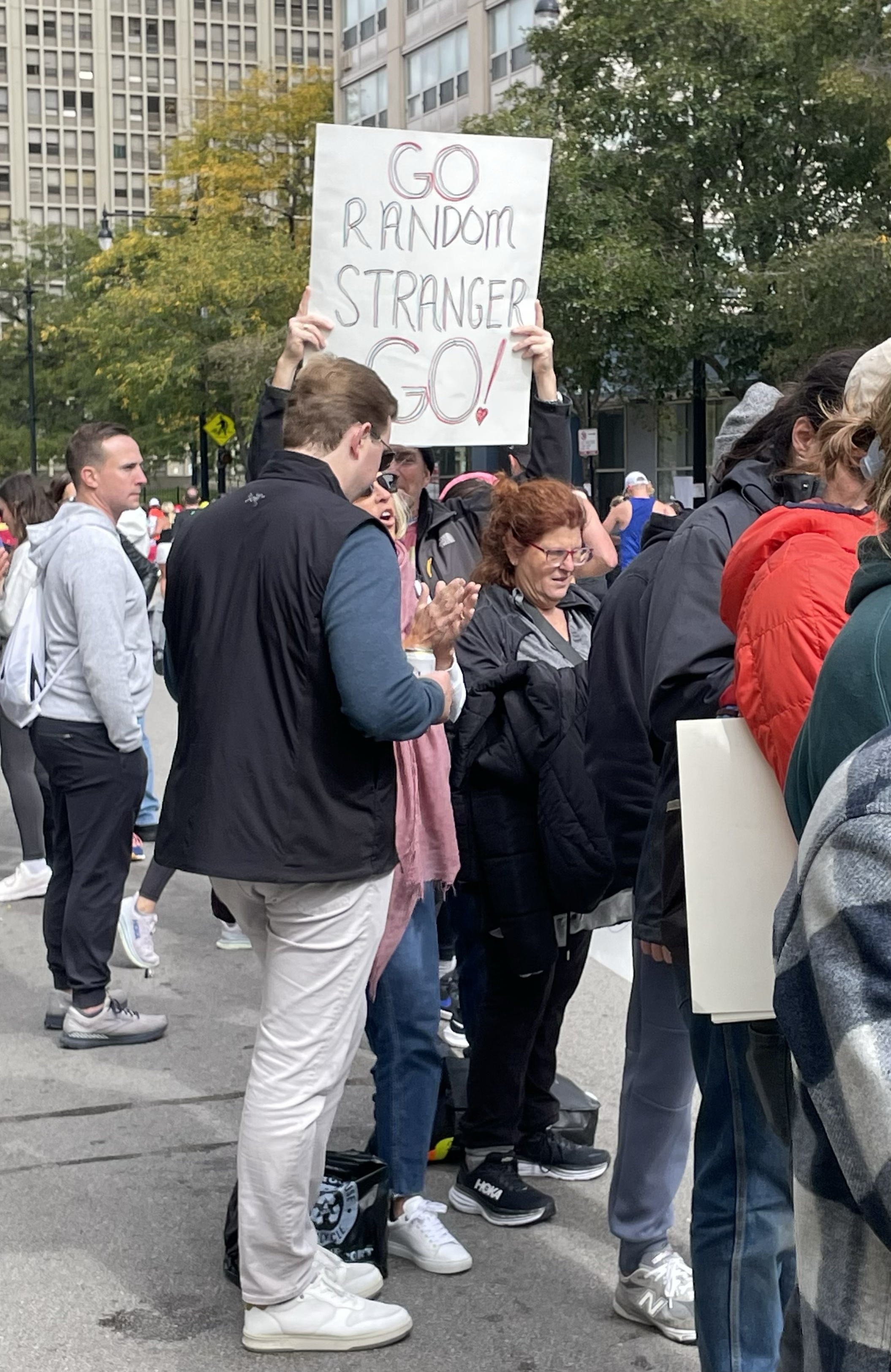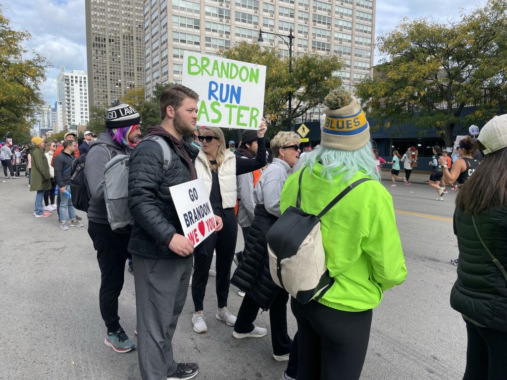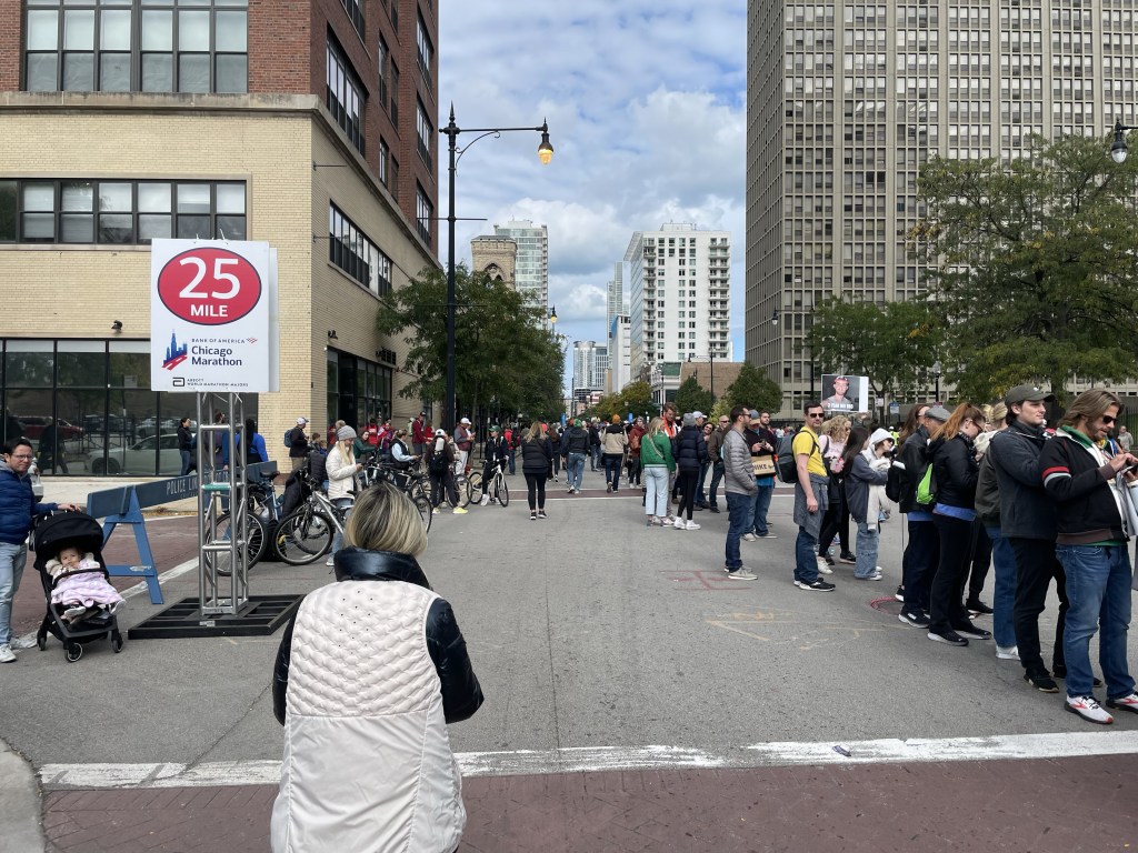 Supposedly, I have time to observe the crowds – and find a place to fit in amongst them – when I arrive in Chinatown. In fact, I manage to eventually finagle a spot right at the fences, and hold up my sign for a good fifteen, twenty minutes, checking my tracking app occasionally to ensure that I haven’t missed her (although this section of the route is narrower than others, allowing a fairly complete view of the runners as they pass by).